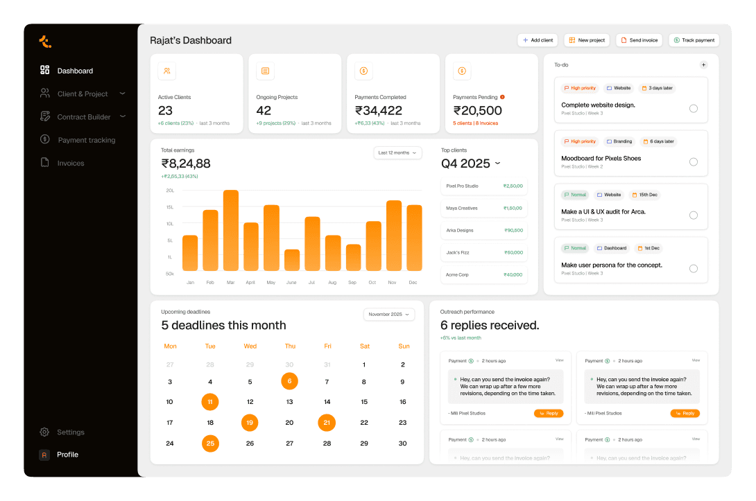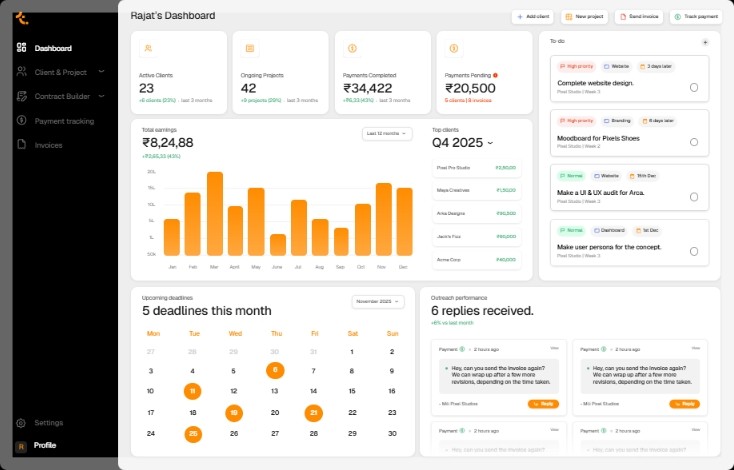 See your work at a glance, revenue, tasks, outreach, and deadlines in one place.